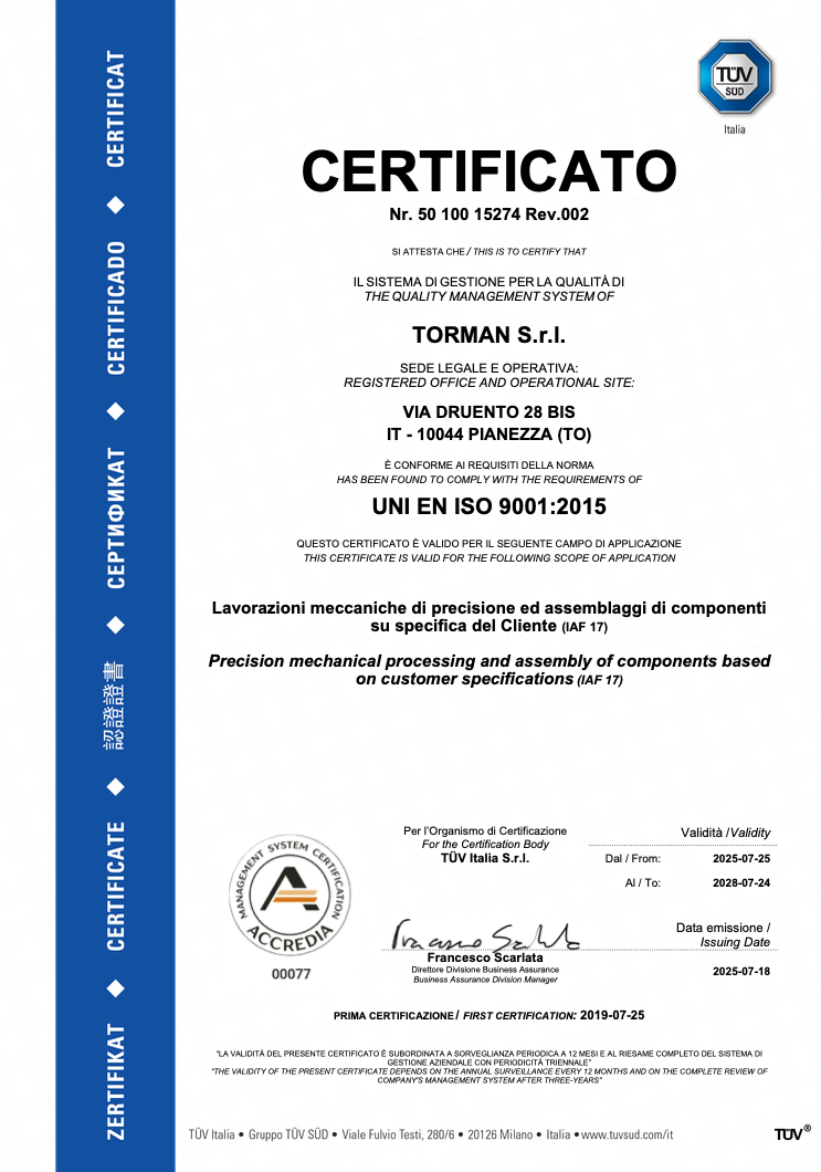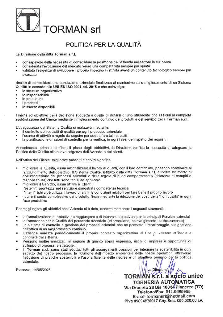 L’obiettivo principale della TORMAN è il raggiungimento della qualità in ogni fase di lavorazione per garantire ai propri clienti il più alto grado di soddisfazione.